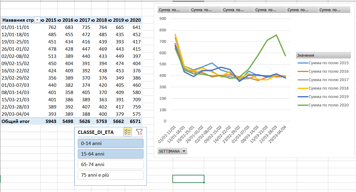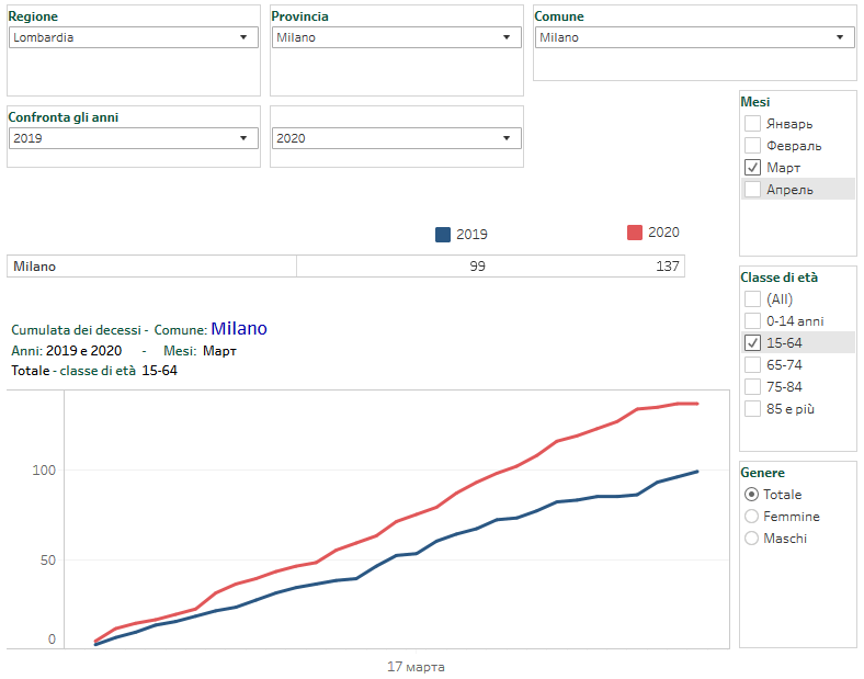 1. Для Милана автор выбирает 2016 год. Самый "урожайный" год по смертям, если покликать по другим годам, то для возрастной группе 15-64 за март будет: