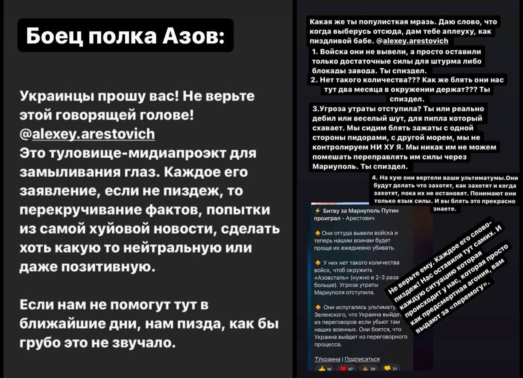 То, что выдает Арестович, уместно для Кукрыниксов или "Железного Капута". Но не для официального глашатая от государства во время войны.