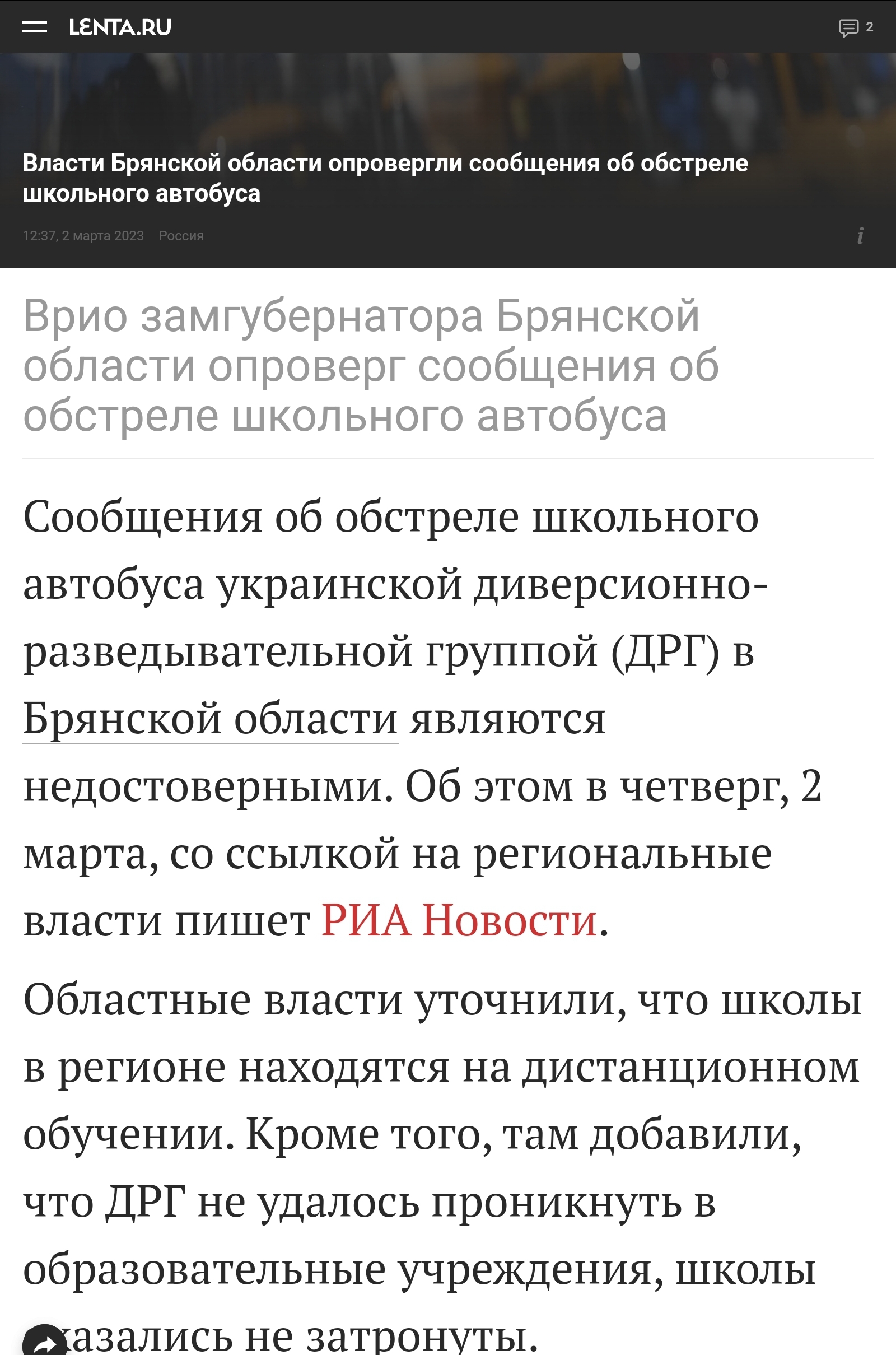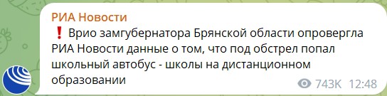Например, про "школьный автобус" ("Врио замгубернатора Брянской области опровергла РИА Новости данные о том, что под обстрел попал школьный автобус - школы на дистанционном образовании").