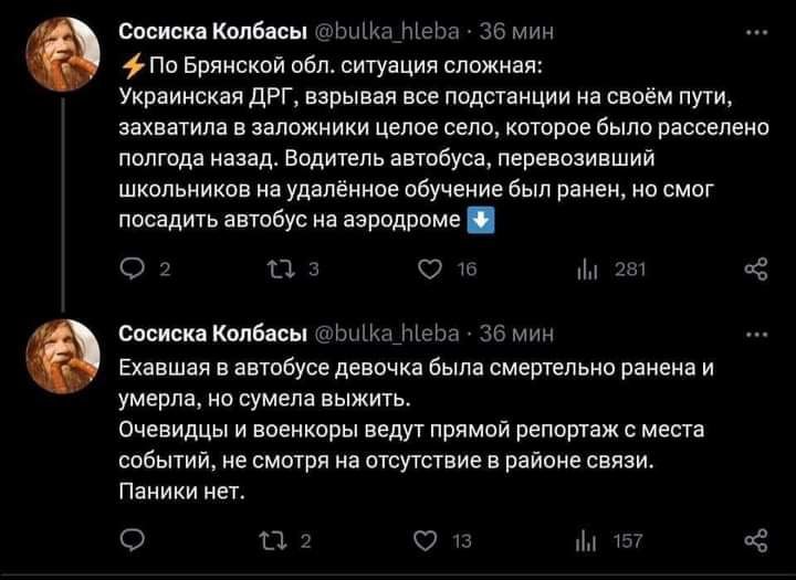 Невзоров вон пишет в Телеграме, что у него аж по четырём надёжным источниками РДК таки заходил на Брянщину. — Бу-бу-бу... (придумайте что-нибудь).