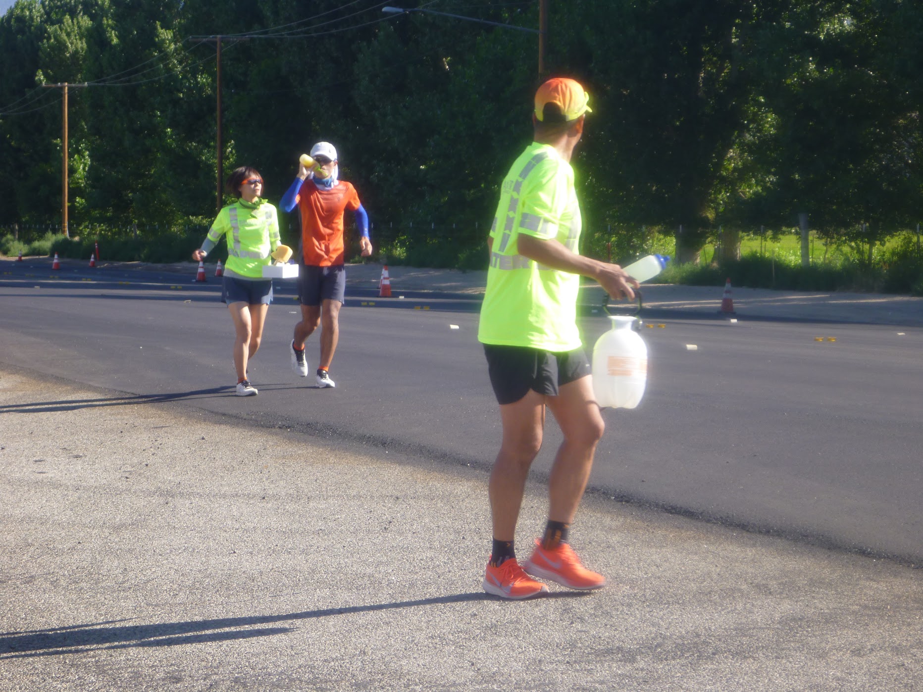 Было +45 градусов на старте в 8 часов вечера. Потом мы переночевали с палаткой, погуляли в горах над долиной (там было +25), погуляли уже по самой долине днем, и в 7 часов вечера (почти сутки после старта) поехали искать, куда там они добежали. Застали чувака-японца, который как раз финишировал первым (photo). Люди были друг от друга на десятки километров.