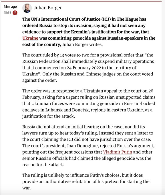 "Суд потребовал, чтобы: Российская Федерация немедленно прекратила военные действия, начатые ею 24 февраля 2022 года на территории Украины. Российская Федерация обеспечила, чтобы "любые направляемые ею или поддерживаемые ею воинские или нерегулярные вооруженные формирования, а также любые организации и лица, которые могут быть подчинены ее контролю, не предпринимали никаких шагов для осуществления военных действий в Украине", - говорится в заявлении суда.