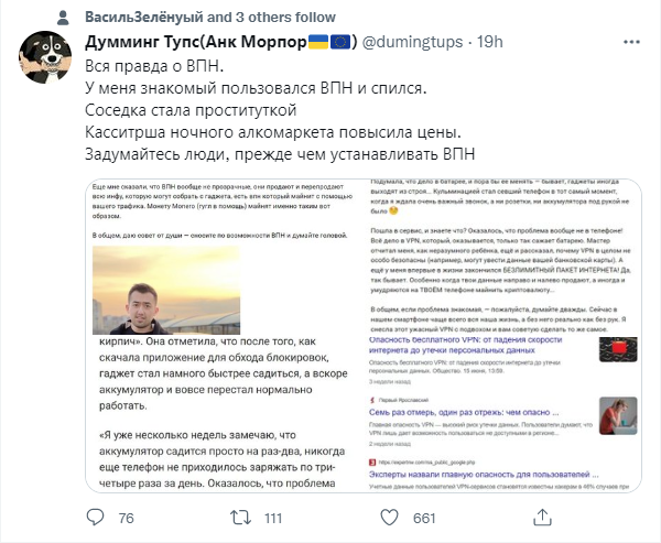 Вот что-то похожее и тут 😄 . Причём, что самое забавное, у миллионов пользователей VPN (Vendetta Pirate Net) всё в порядке, и только у расеян — майнеры прокачивают весь Интернет через батарейку...