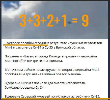 По данным Baza, в результате крушения вертолетов и самолетов погибли девять человек: трое членов экипажа Ми-8, трое членов экипажа второго Ми-8, двое пилотов истребителя Су-34 и пилот истребителя Су-35.