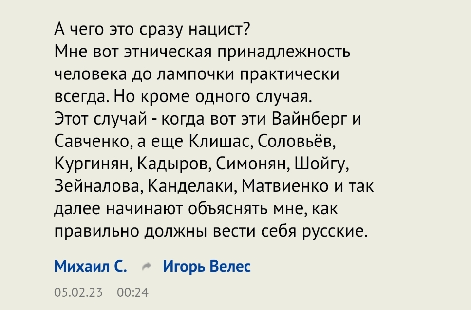 А вот когда, скажем, Симонян заявляет, что я "неправильный русский, по сути, не русский" - вот тут я несколько недоволен. И еще скажите, что у меня нет на это права.