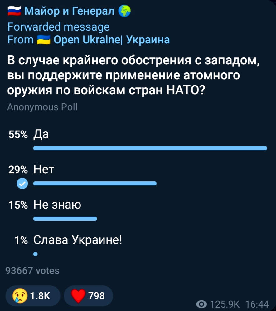 Смотрю и вижу, что в ставке Гитлера тоже понимают свое положение, и тупо и решительно тестируют в соцсетях реакцию населения на вариант применения ЯО.