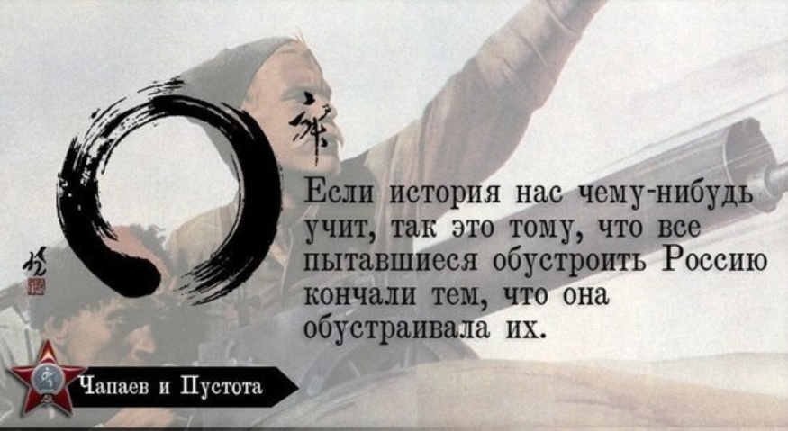 — Да просто чтоб завоевывать. У России другого смысла нету, кроме как больше делаться. Все жертвы, все лишения — всегда ради этого и были. Чтоб только расти дальше. Зачем мы терпим? Чтоб отцам за нас стыдно не было, вона сколько они нахапали. А отцы куда ж столько хапали? Почему жизнь в голоде, в очередях? Чтоб дедам за них стыдно не было. А дедам зачем столько земли было? Зачем деды страх терпели, головы на фронтах клали, в лагерях гибли? Чтоб прадедам не было стыдно за них — при тех-то ого-го сколько земли взяли! Другого оправдания ж нет. Расти надо, и все тут, и пропади все пропадом.