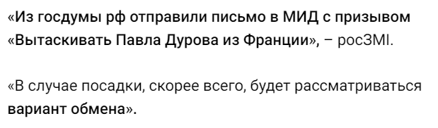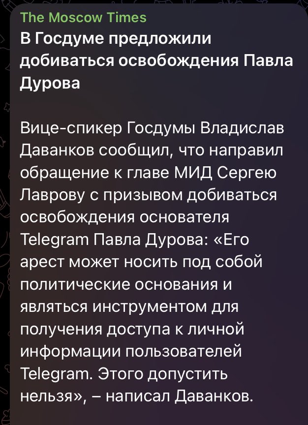 "В конце концов, это не Путин арестовал его [Дурова] за то, что он позволил общественности осуществлять свободу слова. Это западная страна, союзник администрации Байдена и активный член НАТО, заперла его. <...> Тьма быстро опускается на некогда свободный мир".
