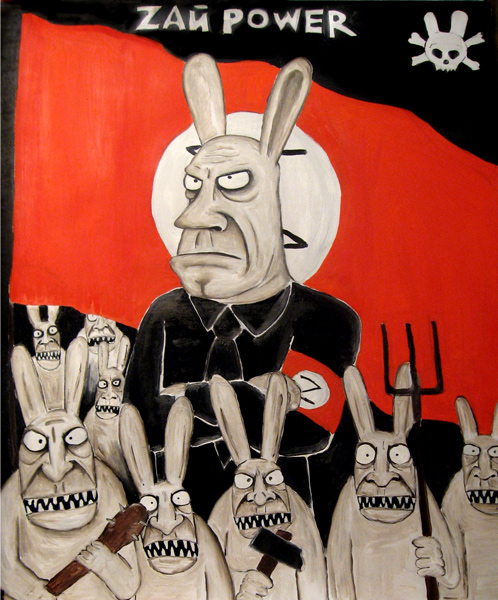 ** а вот флаг со свастикой купить труднее, поэтому его пришлось лепить из чего было, похоже на флаг Австрии на который налепили белый ромб с черной свастикой.