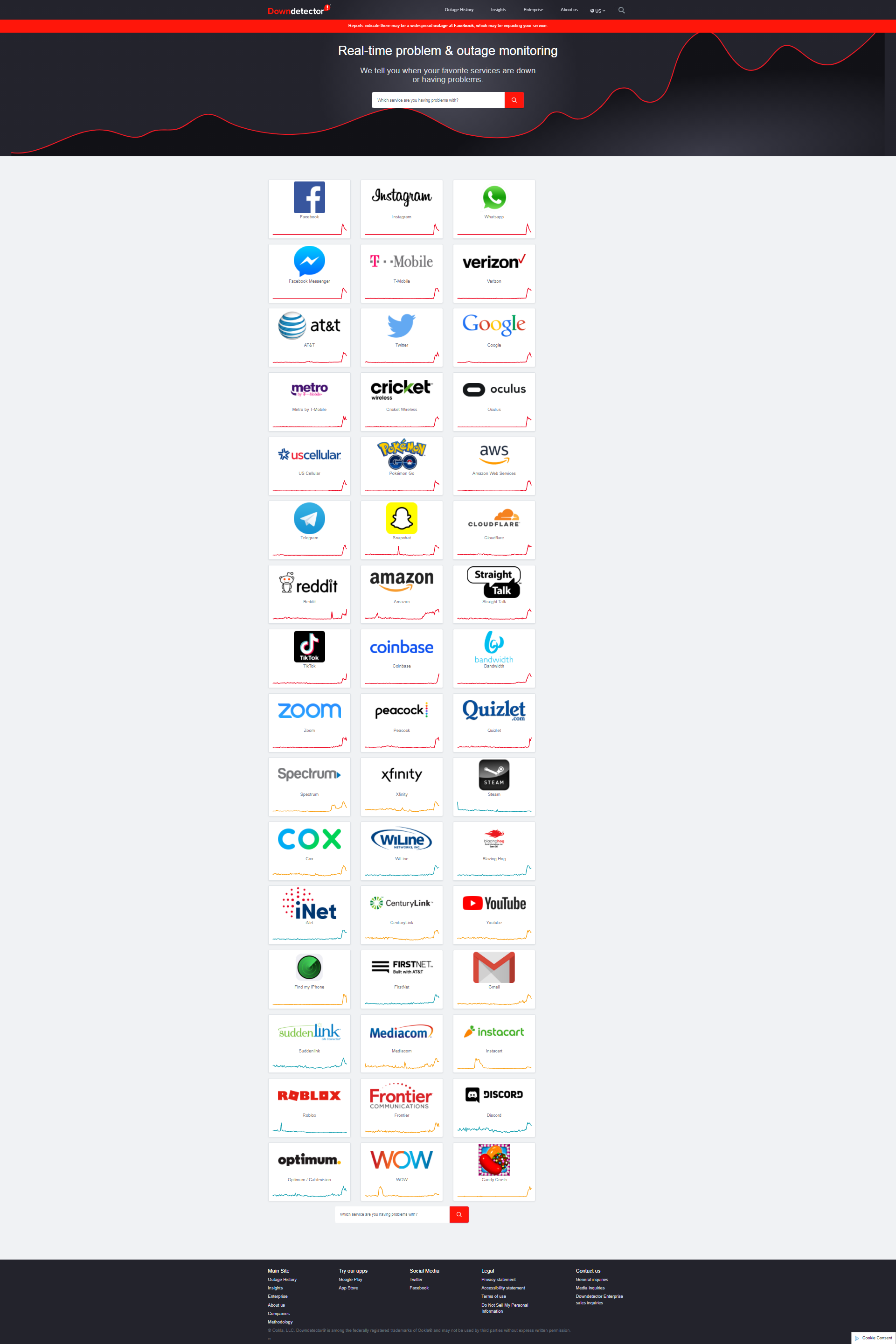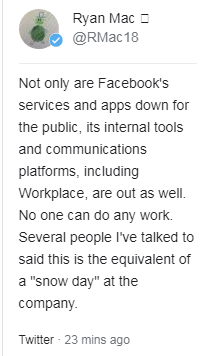 - "Не работают не только сервисы и приложения Facebook, но и внутренние инструменты и коммуникационные платформы, включая Workplace. Ничего не работает"