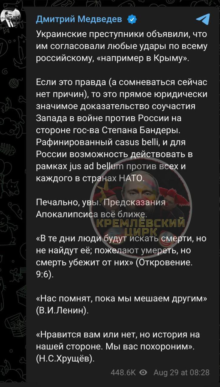 Киевская гамадрилья поискала у себя в волосах и нашла какой-то вшивый проект «гарантий безопасности». Эти псевдогоспода уже давно стоят на карачках перед Белым домом по стойке смирно, не понимая, что являются лишь пешками в крупной футбольной игре. Белый дом хочет оставаться белым и пушистым. Гадости за него вершат куколды, а куколдовод лишь потирает звёздно-волосатые загребучие руки. Действия же киевских политпаралитиков можно описать одним коротким словом – «пролог к третьей мировой войне», вот только развязать её у укрокиевских партнеров пупок развяжется. Я давно говорю: уже давно пора ударить по центрам принятия американский подношений!