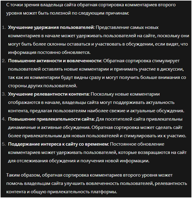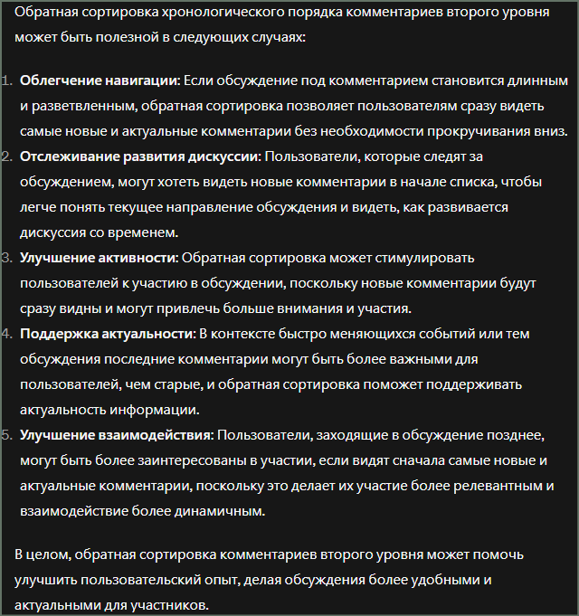 Таким образом, использование обратной сортировки комментариев может быть менее целесообразным, если основная аудитория сайта склонна прочитывать комментарии один раз и редко возвращается для отслеживания дискуссии. В этом случае стандартная хронологическая сортировка может быть предпочтительнее, чтобы не создавать лишнего барьера для пользователей.