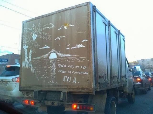 Какой-то стрит-арщик делал что-то подобное с грязными стенами зданий. Это полезнее. И продержится дольше и муниципальные власти не закрасят. Только если отмоют. Вместе с грязью