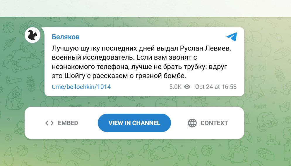 З. Ы. Тем времнем с сообщением о грязной бомбе стал обзванивать своих западных коллег начальник генштаба РФ Герасимов. Уже позвонил в Великобританию, сейчас, поди, ещё с кем-нибудь общается.