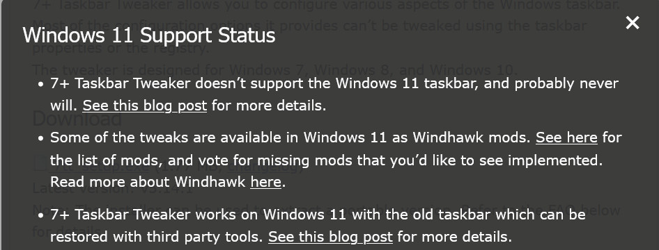 Я просто поправил, что 7+ Taskbar Tweaker не не работает с Windows 11, а не работает со стандартным таскбаром Windows 11. Потому что ExplorerPatcher прямо в Windows 11 просто включает вместо таскбара Windows 11 таскбар Windows 10, код которого Microsoft сознательно оставила внутри поставки Windows 11, и тогда 7+ Taskbar Tweaker прекрасно работает с ним в Windows 11.