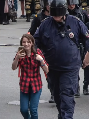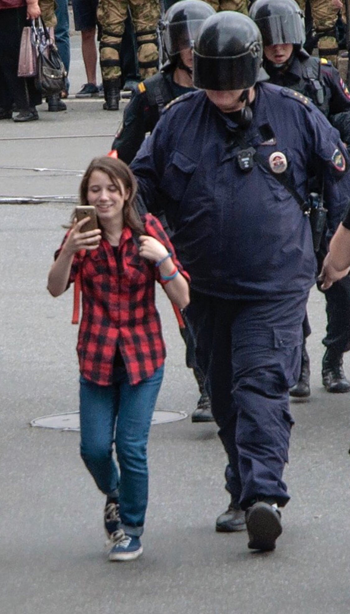 И да, на снимке ее еще корректно ведут. А могли бы и дубинкой.