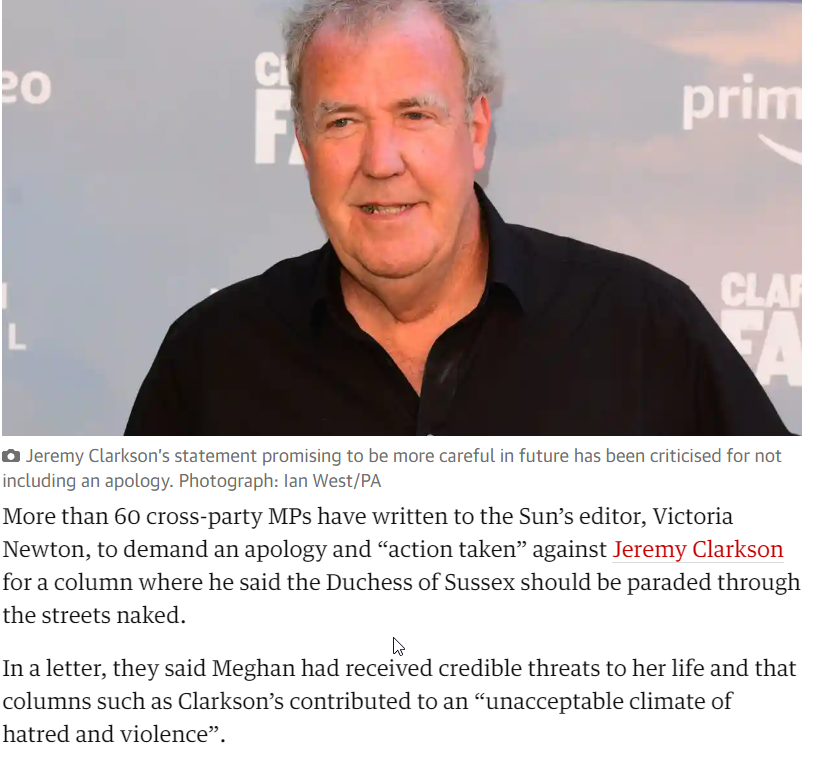 2. Насколько я понимаю ситуацию, Кларксону вообще на всё наплевать. Он свои миллионы заработал, а теперь ему наплевать на то, что вы думаете о его высказываниях. Он вроде ничего там не наговорил, чтобы таскать его по судам (хотя и это для шоу-бизнеса тоже шоу), а до мнения ноунеймов ему вообще нет дела.