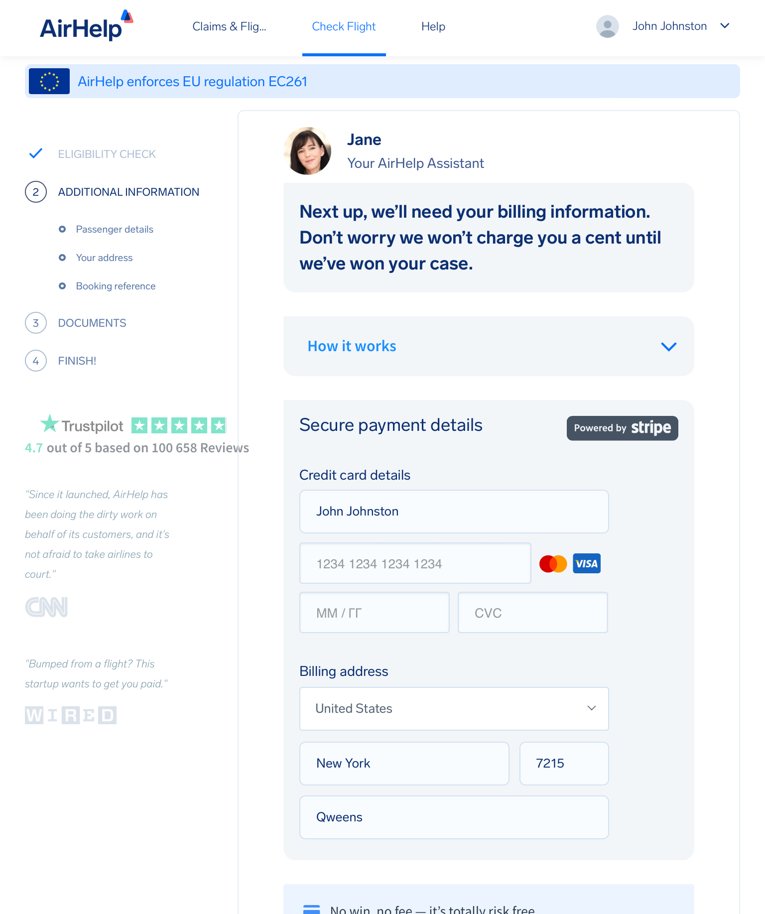 Я только что вбил абстрактные данные и мне положена компенсация! За перелёт из США в Мексику месяц назад. Но надо оставить данные карточки, если я согласен на мировую, то мне дадут €125: