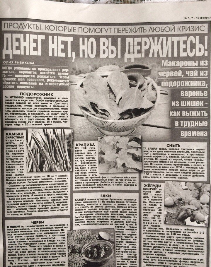 Но у наших же особенная стать 😄 Устроить войну, закидать плодородные земли осколками снарядов, рассориться со всем миром и получить эмбарго на семенной материал - это нормально, это величие нации. А довольных граждан, шоб не стали недовольными, будут кормить белковым суррогатом из чего угодно. Хотя наверняка это даже дороже обычных привычных стейков и хлебцев. Но зато в пику окаянному западу, ачо...