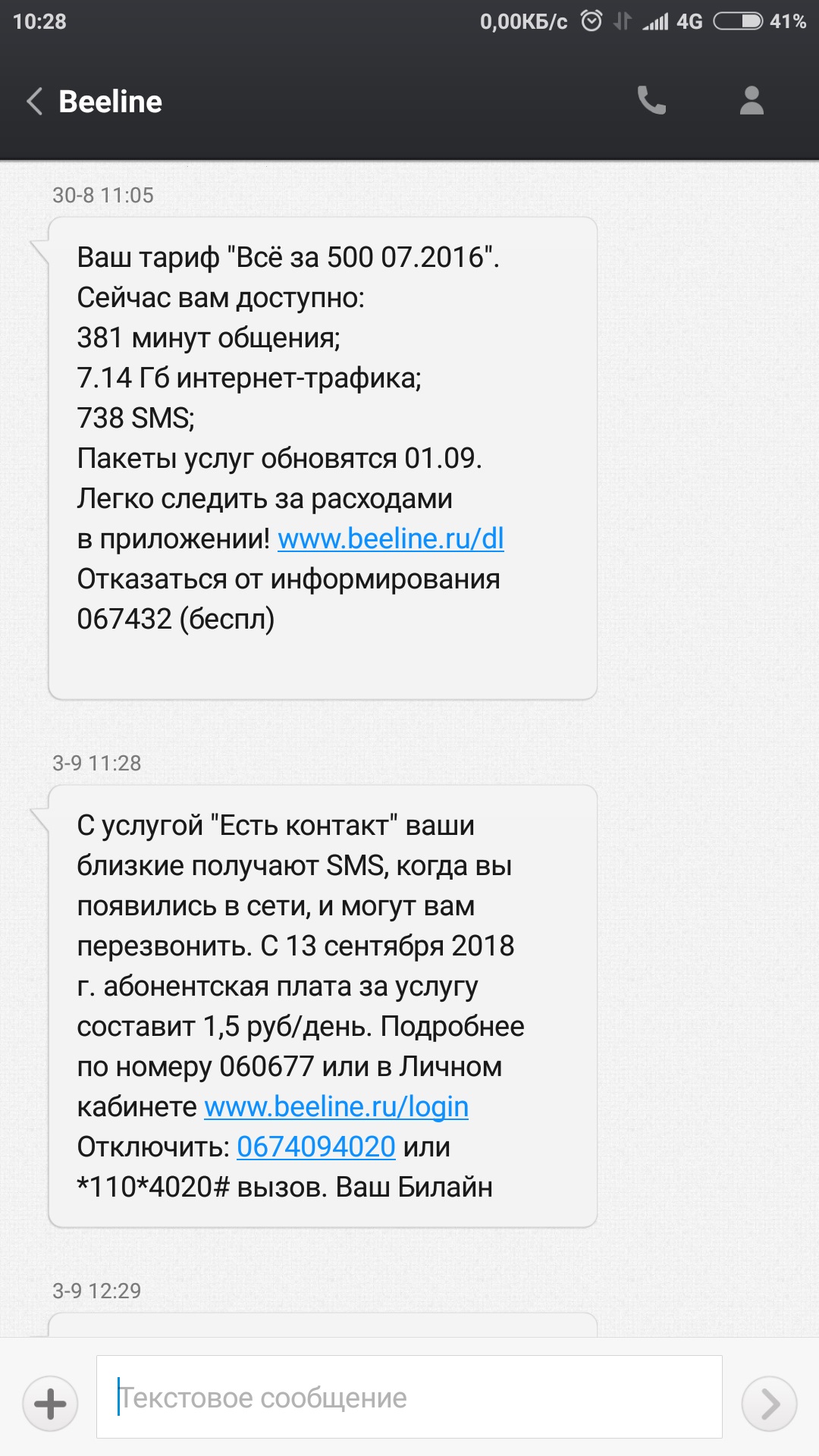 Зато с незапамятных времён подключена услуга "Будь в курсе+". Абонентская плата - 0,95 руб./сутки. Но в службе поддержки меня заверили, что с меня ничего не берут. Похоже на правду... Зато несколько раз мне названивали, предлагали разные другие тарифы, лишь бы скинуть меня с безлимитного Интернета (сейчас ОПСОСы полного безлимита уже, вроде, не дают). Пока держусь, хотя дважды уже поднимали цену: 550... 600 руб.