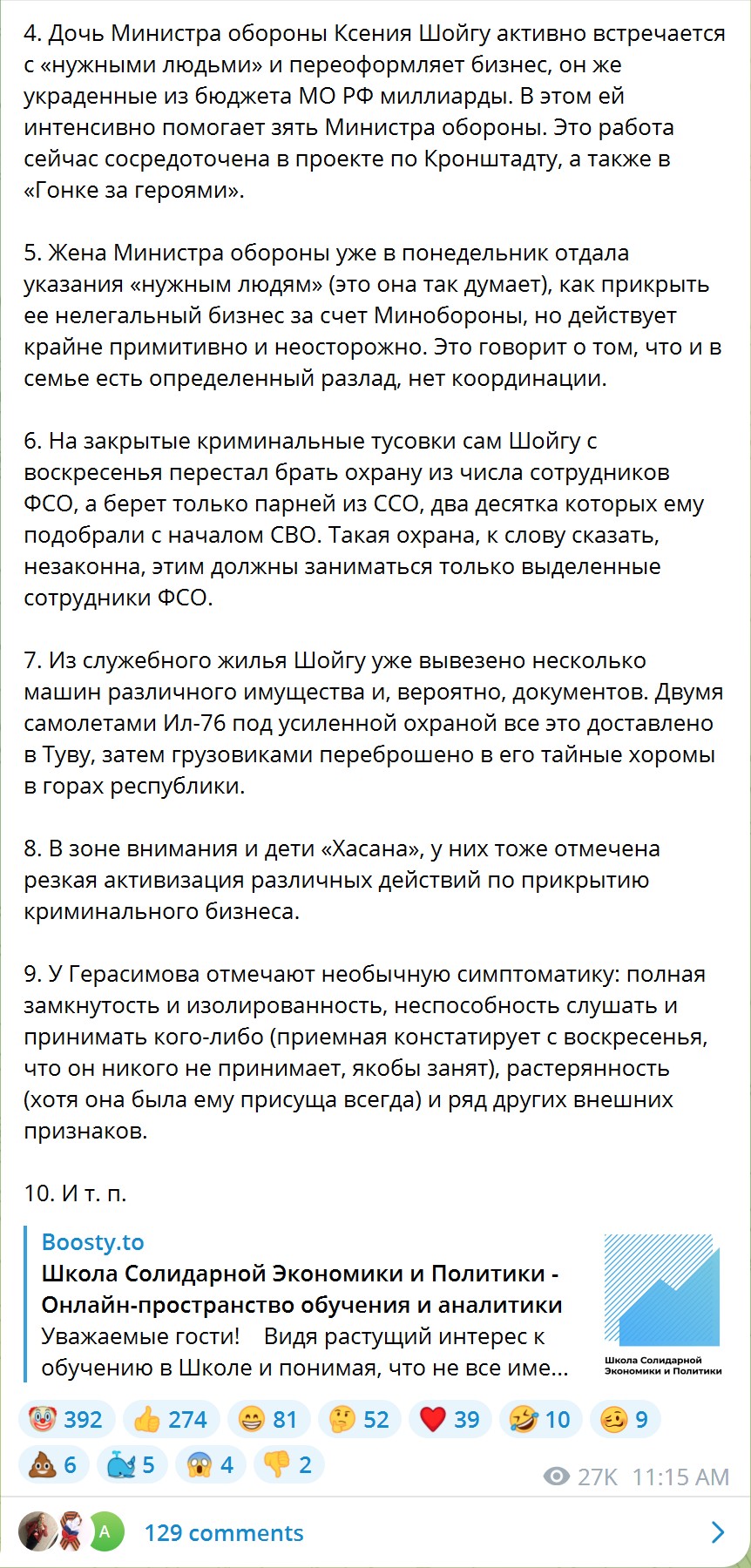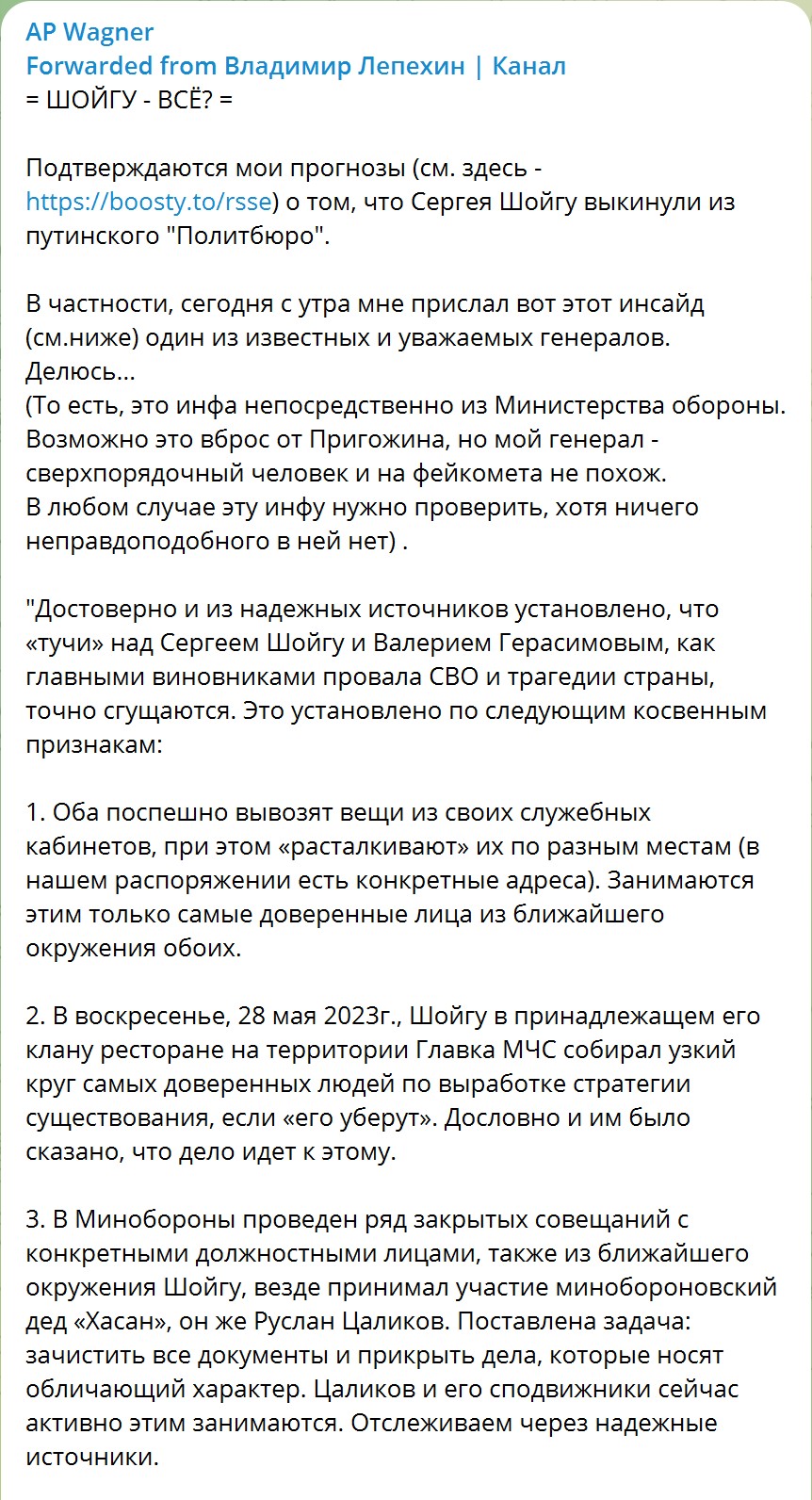 И потом, что конкретно бред? - Что шойгу & Co беспокоятся, что их сделают стрелочниками и пытаются подготовиться? Что пригожин накатывает на него? - так это давно уже. Что тик-токеры вступились и начинается еще один конфликт? - Так о таких перспективах пишут с момента первого массивного использования чвк: при появлении множества чвк государство, как институт, перестает существовать и только вопрос времени, когда они сцепятся между собой.