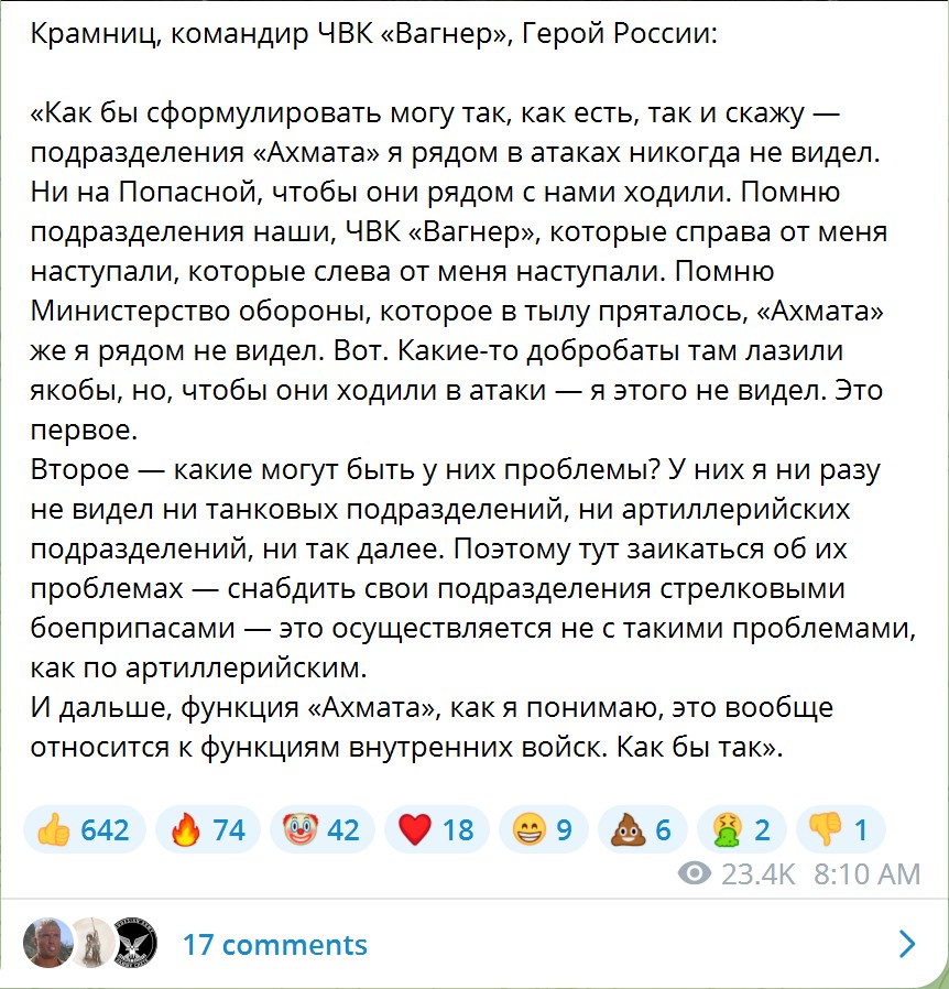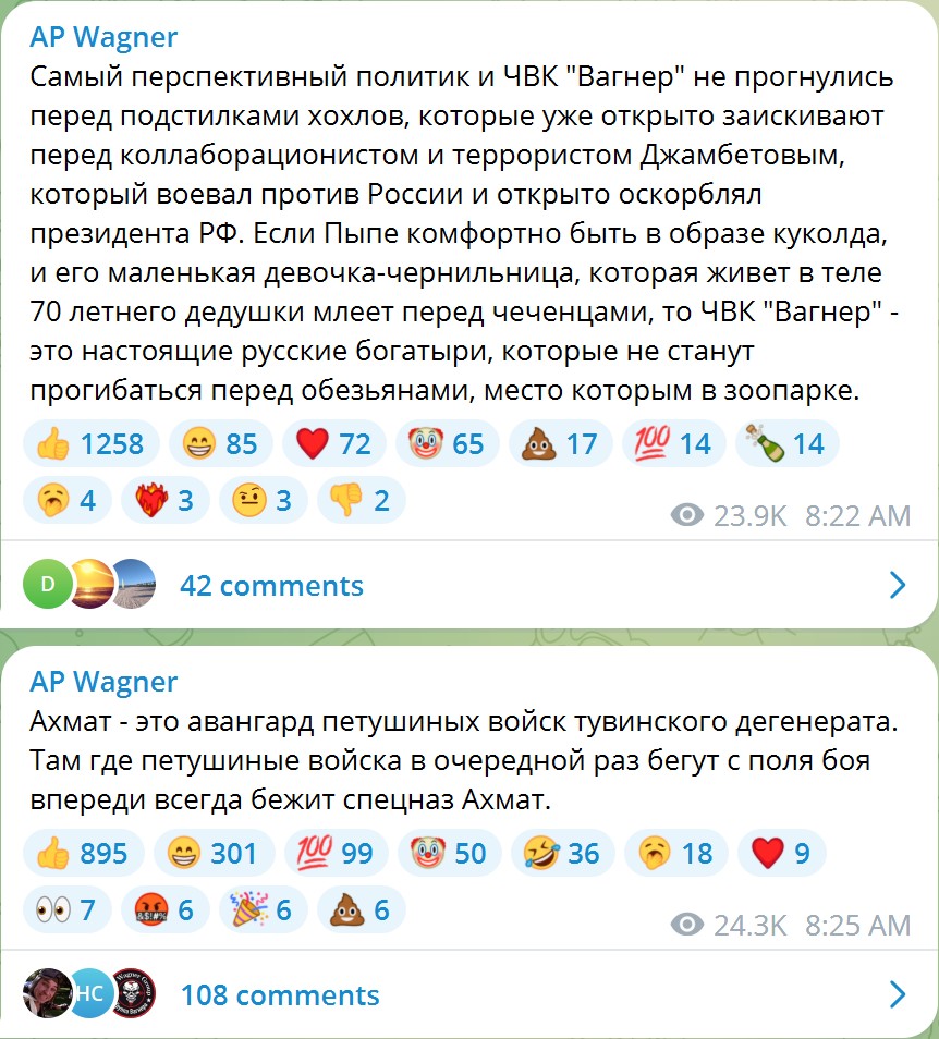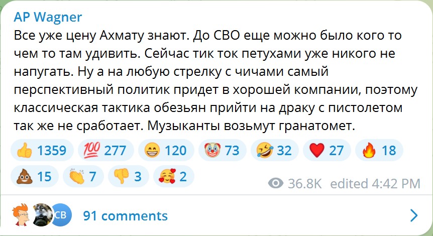 Пригожин "наехал" на чеченский батальон, ему тут же чеченские "товарищи" начали совать в панамку и вот интересный ответ от вагнеровцев: