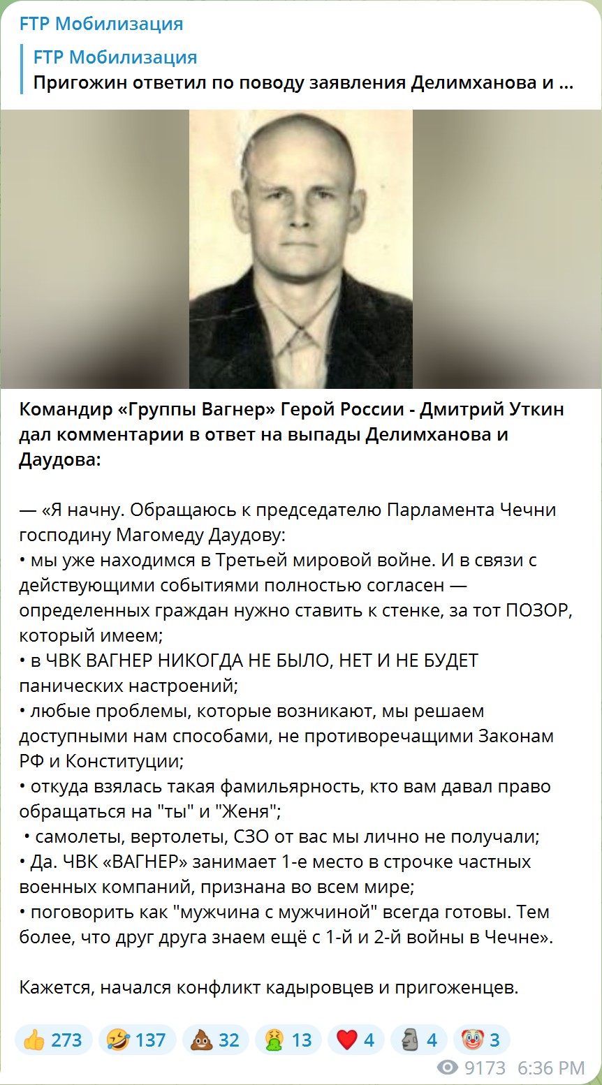 Ответил чеченским политикам также командир ЧВК Вагнера Дмитрий Уткин.