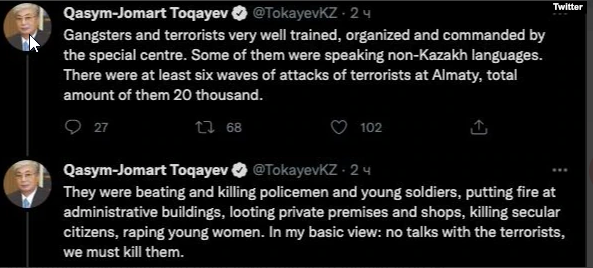Хотя и так понятно, что если вечером 5-го числа Токаев только попросил о помощи, то никаким образом утром 6-го там никто не мог прилететь. Сначала должны были принять решение руководители государств ОДКБ. Потом определить состав сил, откуда их перебрасывать, направить туда транспортные самолёты для переброски. Потом оттуда начать непосредственно транспортировку, плюс час на погрузку техники и час на разгрузку. Всего было задействовано 75 самолётов! И ещё самолёт от МО до Алматы летит 5 часов. В самом лучшем случае, если первый самолёт вылетел днём 6-го января, то прилетели они только вечером (что подтверждается видеозаписью в ленте), как раз к тому моменту когда казахские военные уже восстановили контроль над городом.