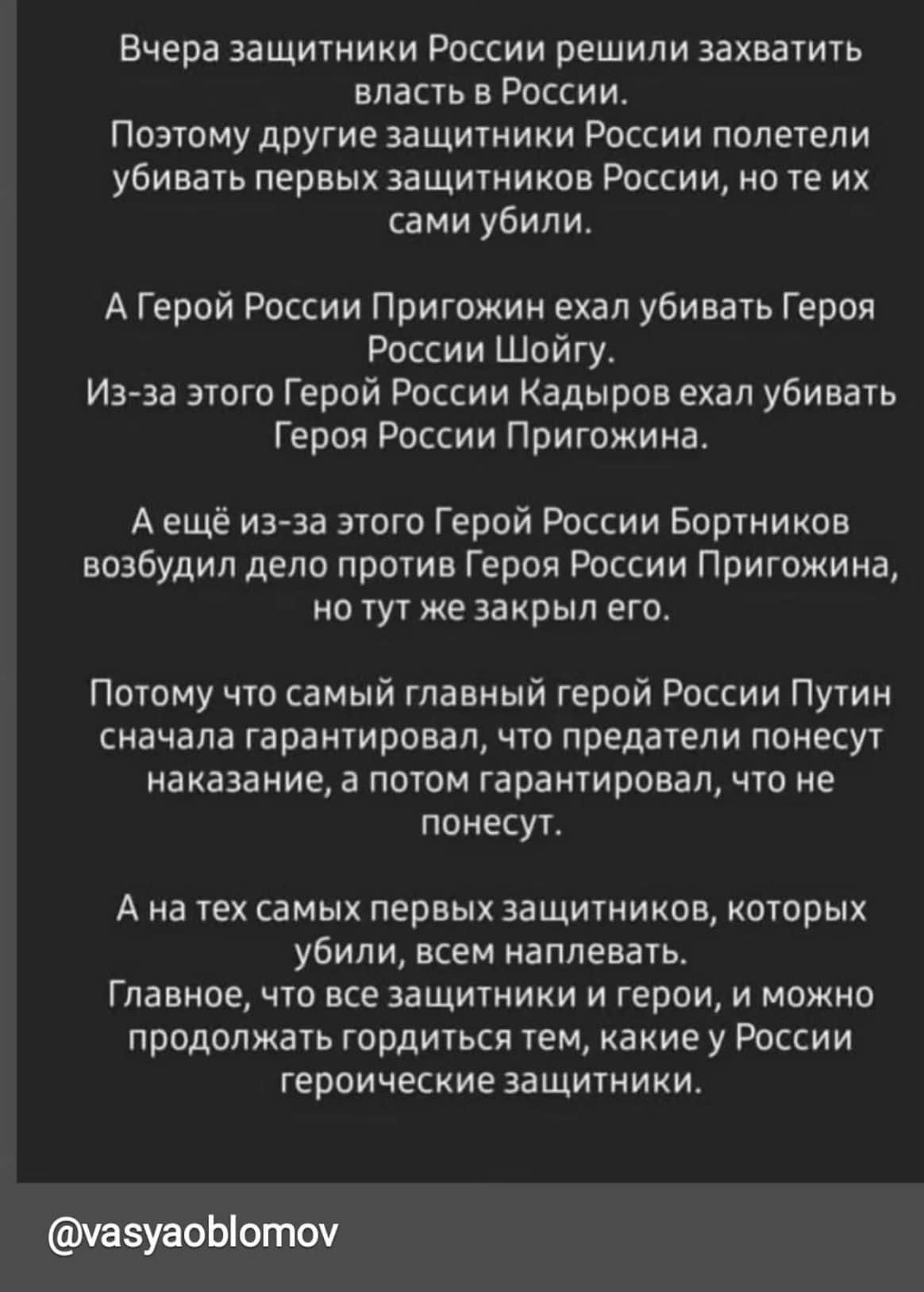 Теперь же всё, путин показал себя даже наглухо отбитой вате дряблым содержимым собственного чемоданчика, Пригожин выставил себя клоуном, а череп на эмблеме бывшего Вагнера, а теперь Вагинера, следует заменить на петушиный.