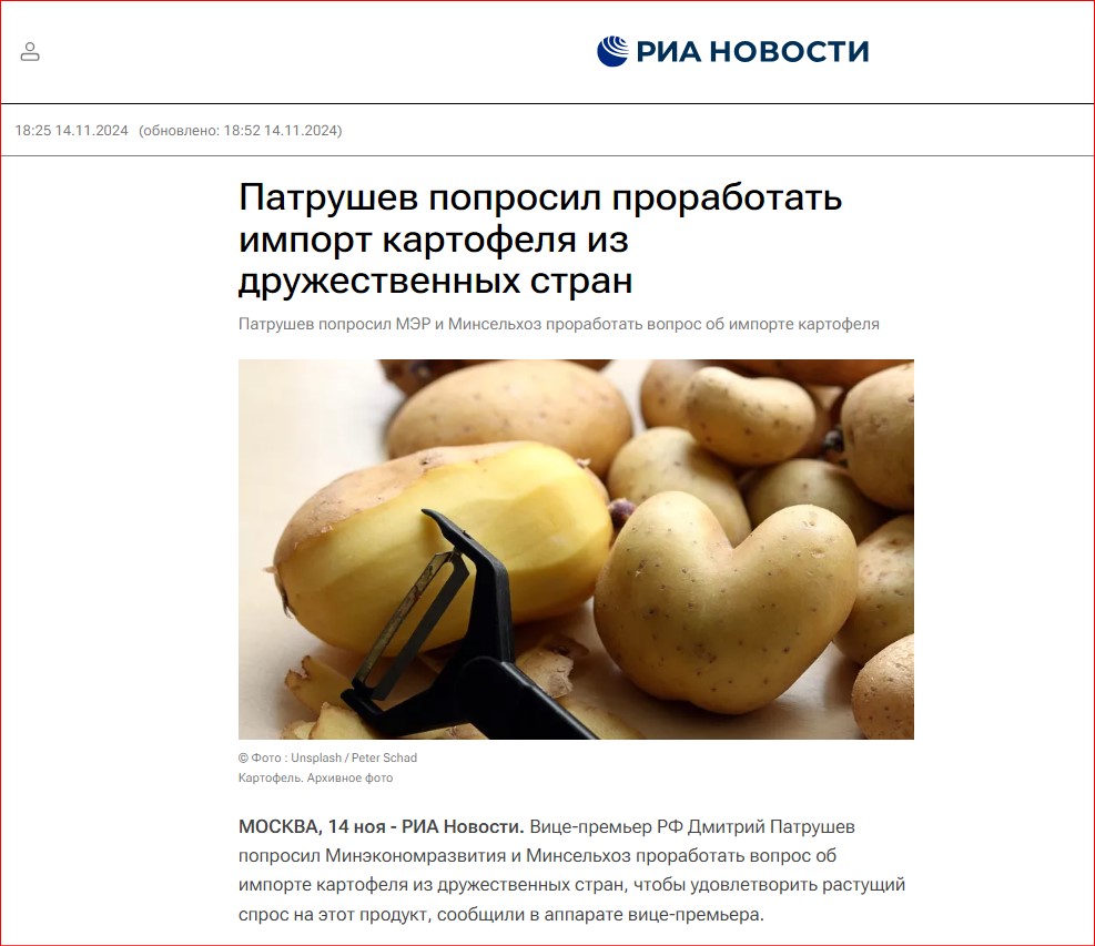 Патрушев попросил Минэкономразвития и Минсельхоз проработать вопрос об импорте картофеля из дружественных стран, чтобы удовлетворить растущий спрос на этот продукт