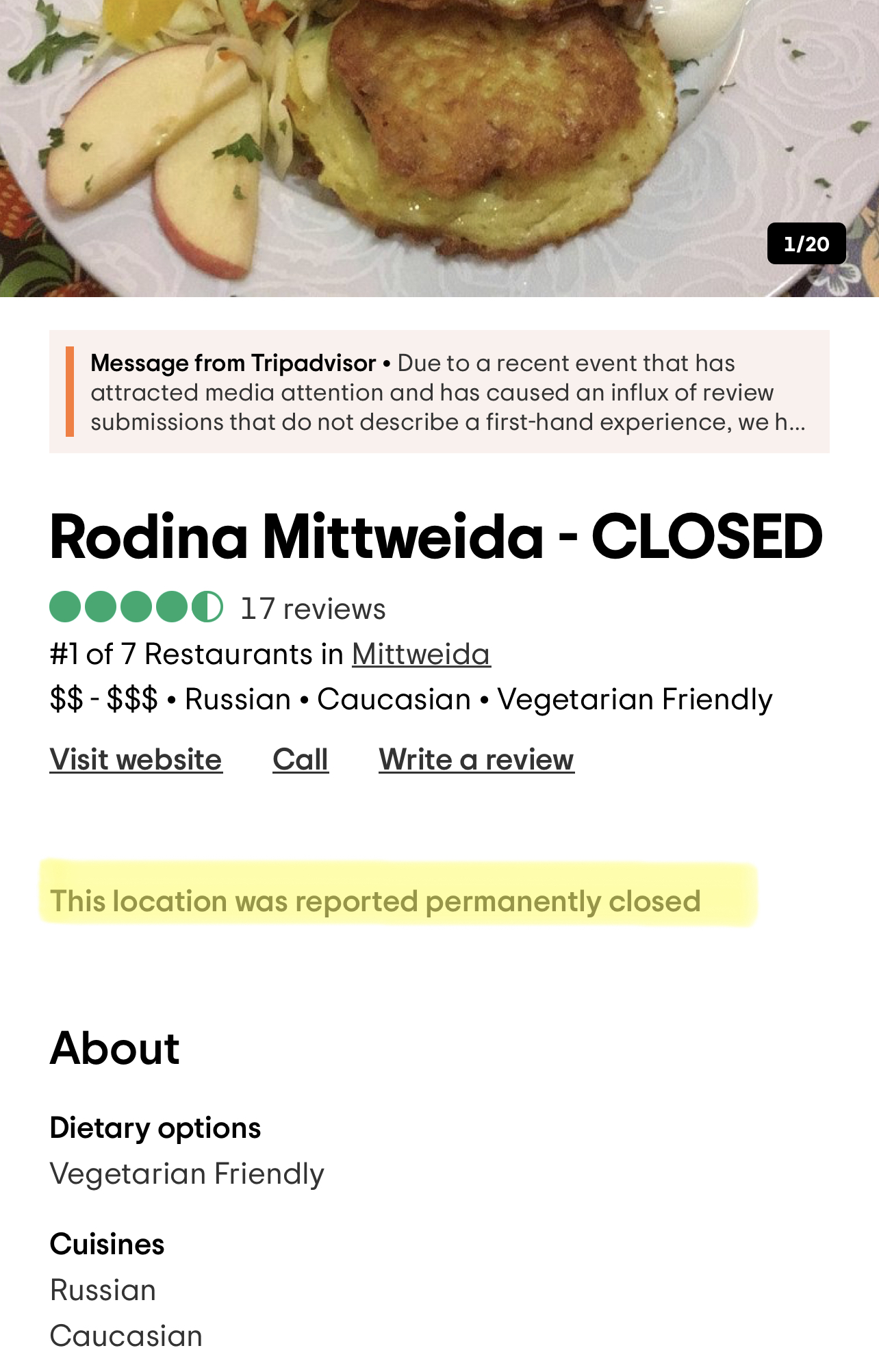 Для тех, кто не владеет немецким, краткое содержание: девушке 30 лет, 20 лет живёт в Германии, приехала с родителями, русскими немцами. Ресторан открыли 6 лет назад. Мать готовит, она обслуживает посетителей. Оценка у ресторана 4,6 из возможных 5 баллов.