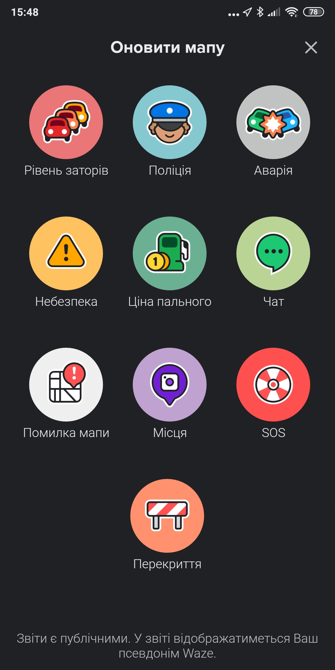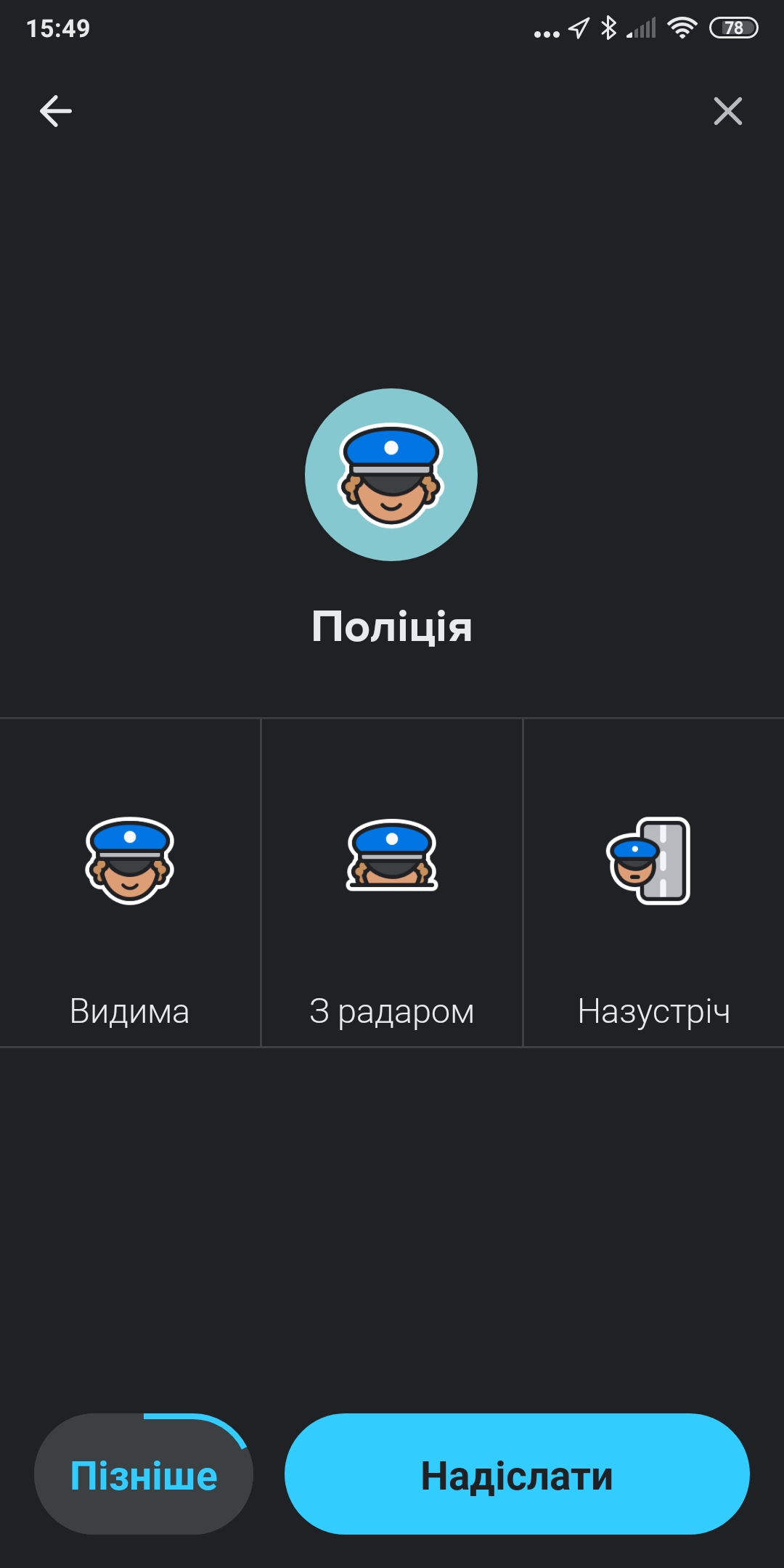 2. Нельзя задать кастомные Favorites любимых ярлыков. Допустим, одно из самых распространенных предупреждений в Европе - "Опасность на обочине", когда стоит авто. Мне на ходу надо залезть в меню, выбрать Hazard, Shoulder, Vehicle Stopped - это небезопасно. Да, на iOS можно нажать на кнопку и удержать палец, тогда вылезет 3 события: траффик, опасность и полиция, но всё же. У меня 90% предупреждений это - "Обочина", "Ремонт" и "Полиция", удобно было бы фавориты создать и одним нажатием из меню вызывать.