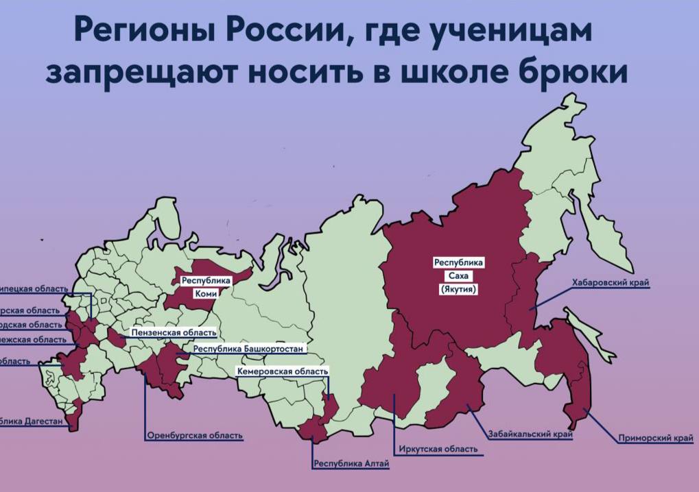 О запрете на брюки для девочек в учебных заведениях сообщают из Хабаровского и Приморского края, Якутии, Алтая, Воронежской, Ростовской, Иркутской, Пензенской, Оренбургской области и других.