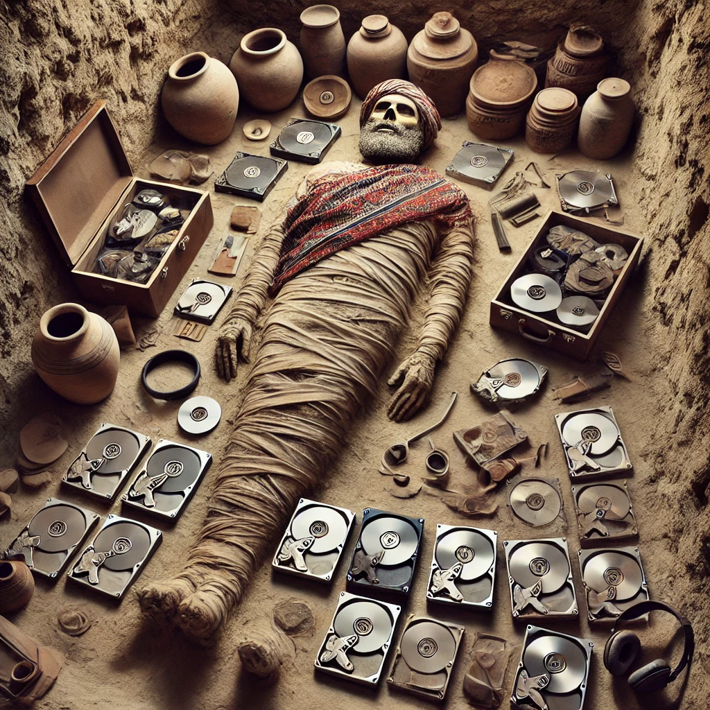 "сгенерируй картинку раскопок древней могилы, в которой мумия хипстера явно важного при жизни судя по реликвиям лежащим рядом - среди которых лежат и компьютерные жесткие HDD-диски, реалистично"