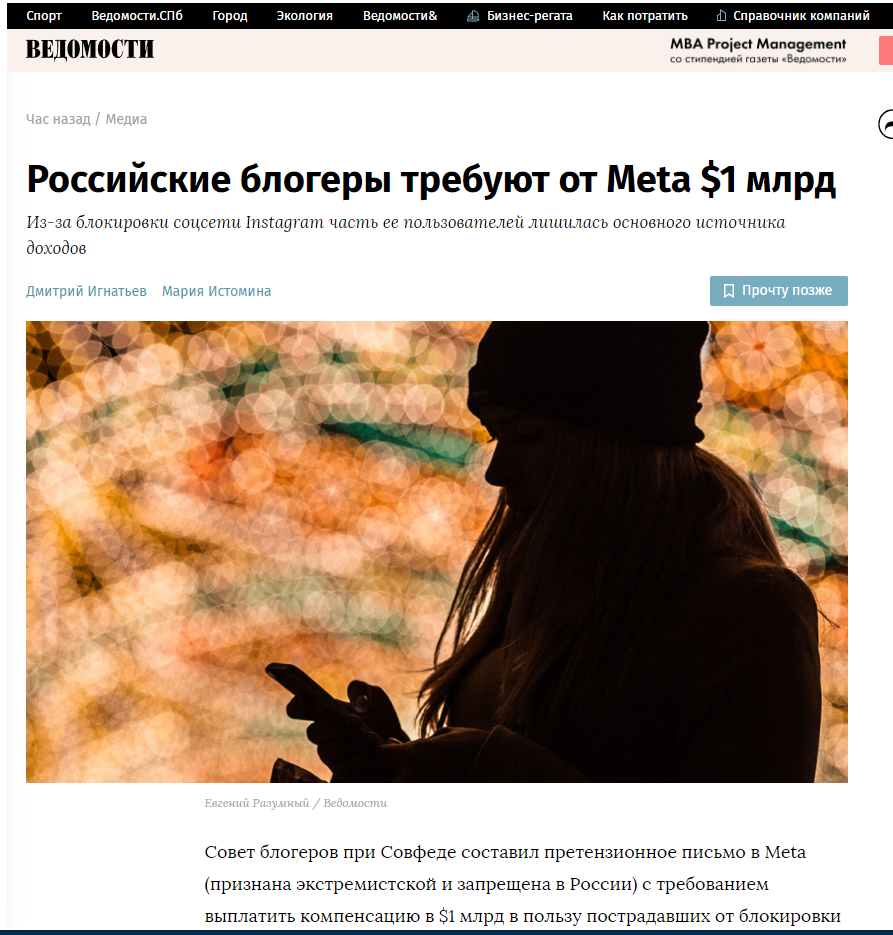 Совет блогеров при Совфеде составил претензионное письмо в Meta (признана экстремистской и запрещена в России) c требованием выплатить компенсацию в $1 млрд в пользу пострадавших от блокировки пользователей и предпринимателей соцсети Instagram (принадлежит компании Meta, соцсеть запрещена и заблокирована на территории России). Об этом сообщила 31 марта на круглом столе в Общественной палате основатель этого совета Валерия Рытвина. Также в письме содержится требование к Meta публично принести извинения гражданам России.