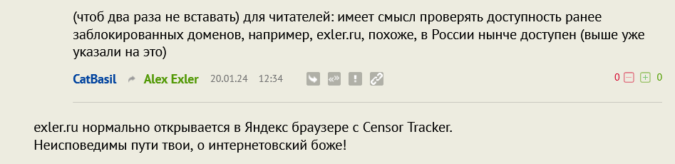 (чтоб два раза не вставать) для читателей: имеет смысл проверять доступность ранее заблокированных доменов, например, exler.ru, похоже, в России нынче доступен (выше уже указали на это)