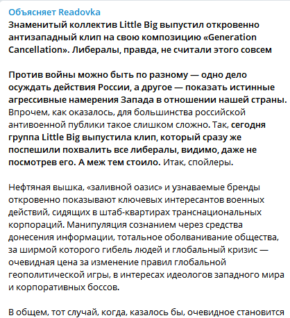 «Мы обожаем свою страну, но мы полностью не согласны с войной в Украине, более того мы верим, что любая война неприемлема. Мы осуждаем действия российского правительства, а также нам настолько отвратительна машина российской военной пропаганды, что мы решили бросить все и уехать из страны», — сказал лидер Little Big Илья Прусикин («Ильич»).