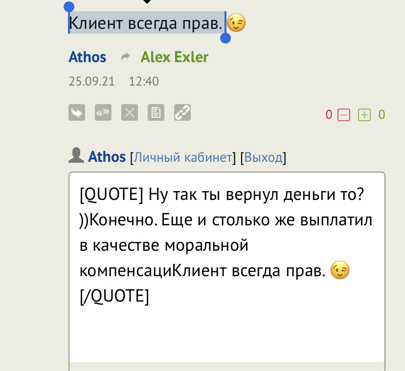 Например, сейчас, чтобы процитировать этот фрагмент твоего комментария мне пришлось удалять его большую часть, хотя выделил именно нужный мне текст и нажал вот эту кнопочку. (Игори-сан, привет)