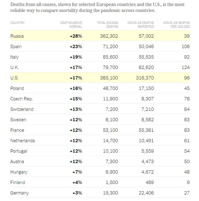 Россия вышла на первое место по избыточной смертности во время пандемии.