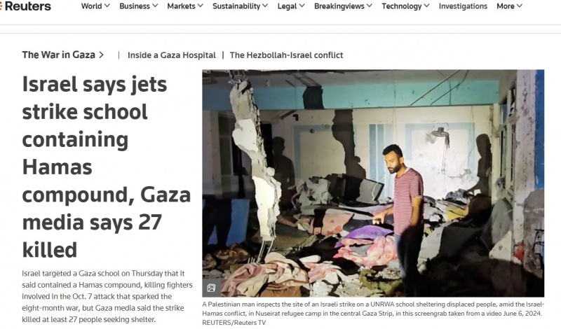 Здесь просто школа, чтобы не бросать тень на ООН, но дан намек и на ХАМАС. Правда, в подзаголовке со ссылкой на "представителей палестинского здравоохранения" уточняется, что "в результате удара Израиля по школе, где размещались исключительно перемещенные семьи, погибли по меньшей мере 33 человека, в том числе 23 женщины и 10 детей". То есть никаких террористов не было, хоть "военные и утверждают".■ Reuters: "Израиль заявляет, что самолеты нанесли удар по школе, где находится комплекс ХАМАС, в Газе сообщают о 27 погибших".