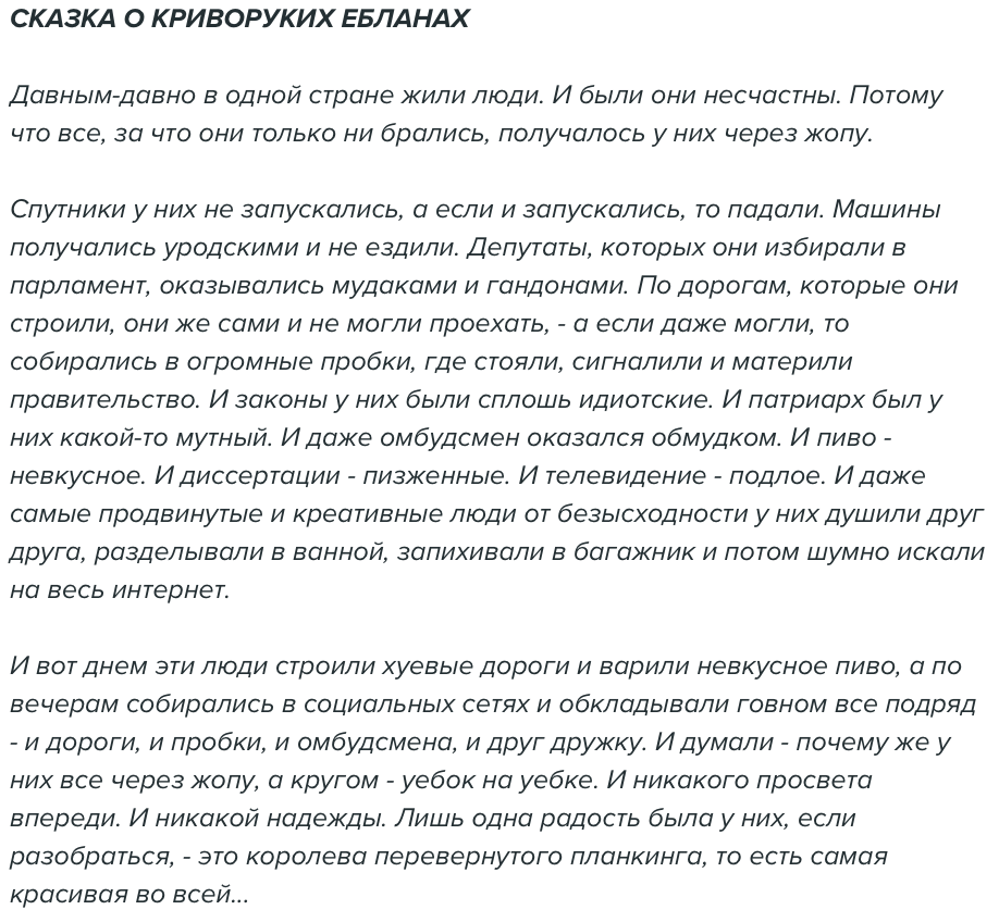 Он этот "факт" неделю излогал в камментах в телеге, но Алекс опять вероломно их отключил, когда нашего Борю там окончательно расколбасило на фоне систематического игнорирования предписанных медикаментов.