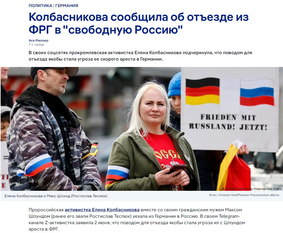 Колбасникова сообщила об отъезде из ФРГ в "свободную Россию"