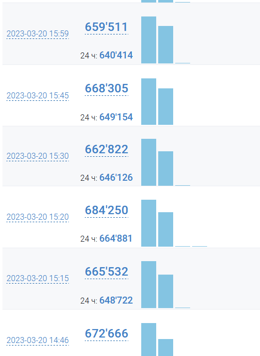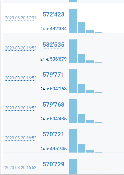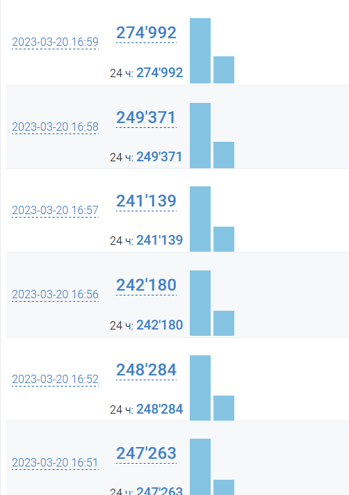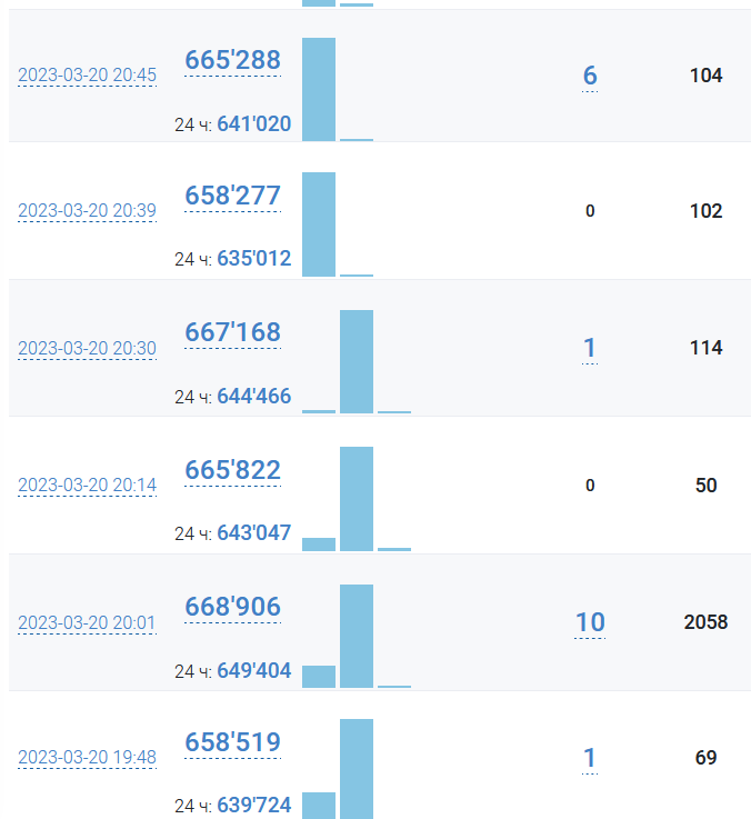 Каждый голубой столбец - просмотры в каждый день, даты стоят одинаковые. На основе частотного распределения определите где канал, которые просматривают живые люди, а где каналы, накручивающие просмотры