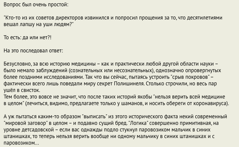 Классика сетевой демагогии: "Какие ваши доказательства? Где пруф?" - Вот ссылка. "Это неавторитетное мнение" - Вот еще несколько, вот мнение эксперта. - "Это вырвано из контекста" - Вот полный текст. "Это ангажированное и предвзятое мнение"... И так до бесконечности. Как и в случае шулером, единственная ошибка - начать общение с демагогом. В отличие от Камеля, который иногда что то спрашивает, вы в курсе всего и всегда, лучше всех и раньше каждого. Я все сказанное выше прекрасно знаю, все ж 4 года спец психологии, и вообще ведусь только потому что время есть, благодаря таким как вы зашуганым адептам ковида