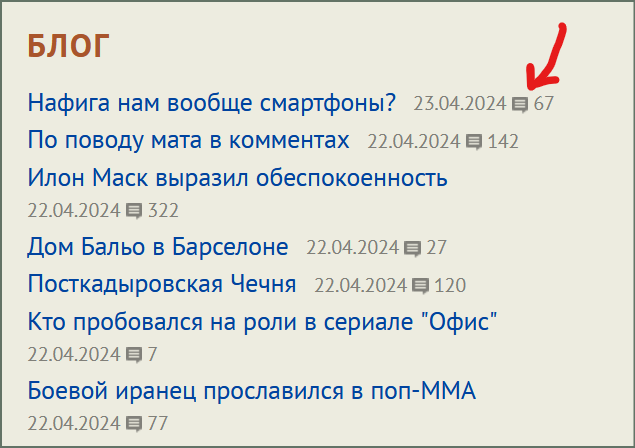 3. В блоке "Блог" кликаю колесиком на иконку комментов (см. скрин) возле интересующей заметки, чтобы открылась новая вкладка (это вынужденная мера из-за не устраивающей меня сортировки, далее будет понятно почему делаю так);