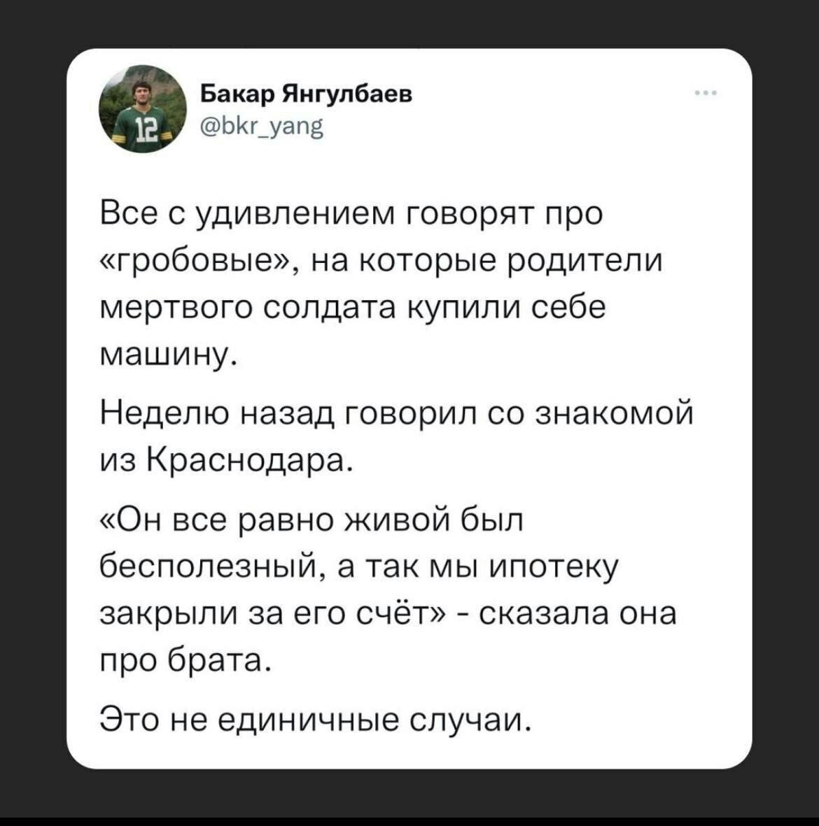 Говорят, что россиян расчеловечивает украинская пропаганда. Те, кто это снял, не понимают, что российская пропаганда их расчеловечивает ещё больше. Потому что "в память о сыне купили новенькую машину", понимаешь, что они не то, чтобы радуются, что сын погиб, но и не особо прям грустят.