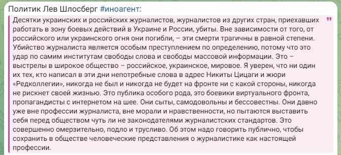 Люди, называющие журналиста «законной военной целью», не могут иметь никакого отношения к журналистике. Люди, призывающие лишить убитого журналиста журналистской премии, – это мародёры. Именно в этих своих злобных и циничных репликах они – настоящие, подлинные, неотретушированные. Всё проявилось, всё вылезло наружу. Смотрите и запоминайте. Никогда не имейте с этими людьми никаких дел. Никакой мирной и свободной страны мы с этими людьми не построим.