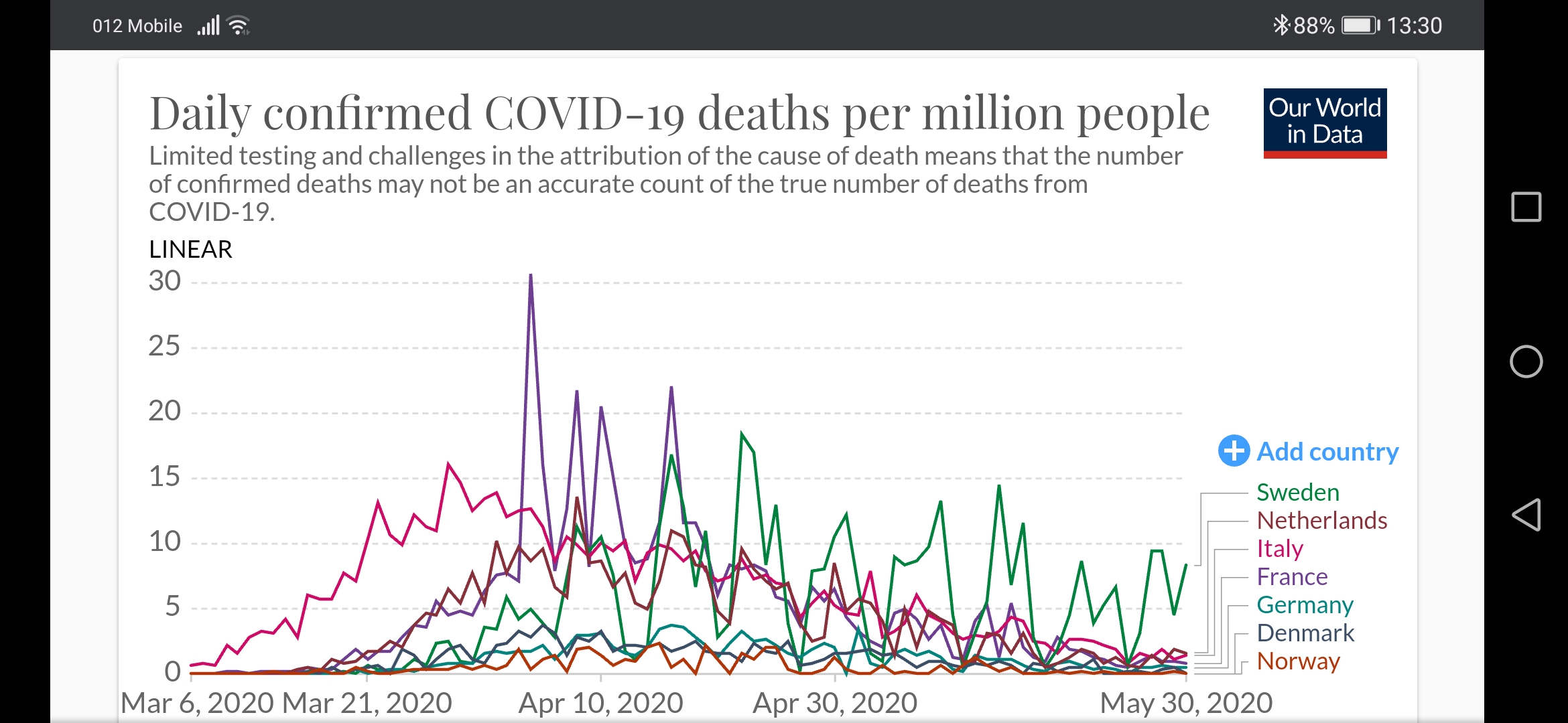График общей смертности в Швеции растёт линейно, ~70 человек в день (7 на миллион). Это статистика, а истории из серии "а у нас в квартире газ", "а мне летать охота", "а я дедушку любил", "ты был в Керчи?" только частные случаи.