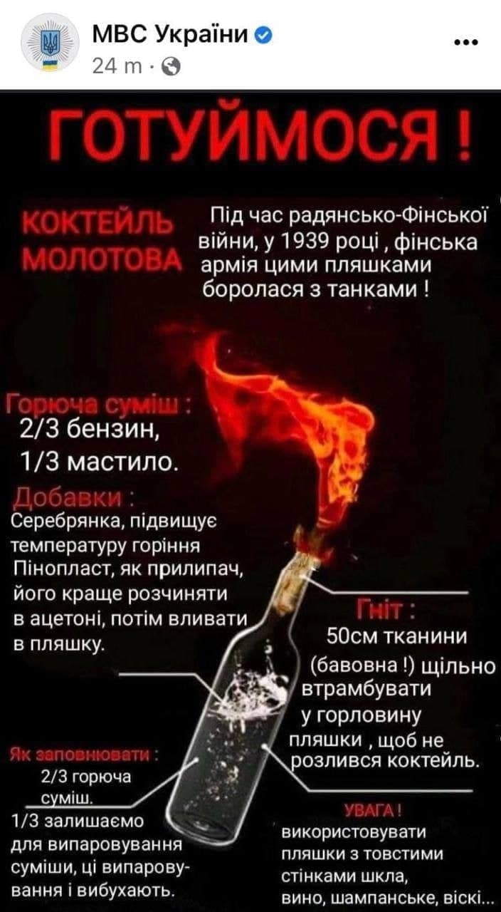 Он поддержал рекомендацию для жителей запастись молотовыми коктейлями.