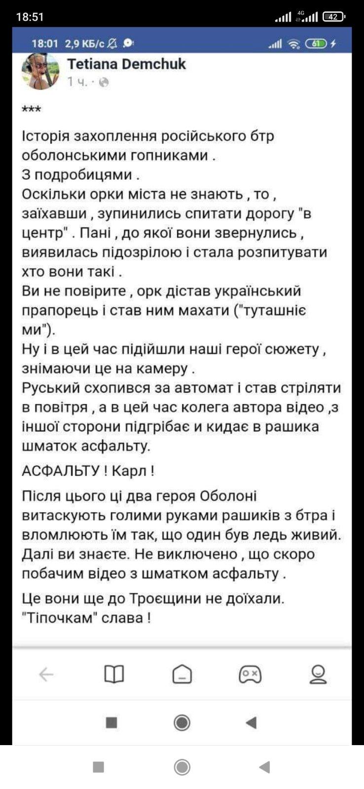 «На Оболони сейчас катается российская бронированная техника в количестве одной единицы. Скорее всего, это, возможно, был какой-то передовой затерявшийся дозор. Возможно, они ехали как раз через Гостомель. Россияне не знают местности, поэтому не знают, куда они едут по существу», - рассказал в комментарии УНИАН рассказал пресс-офицер бригады быстрого реагирования Нацгвардии Харитин Старский.